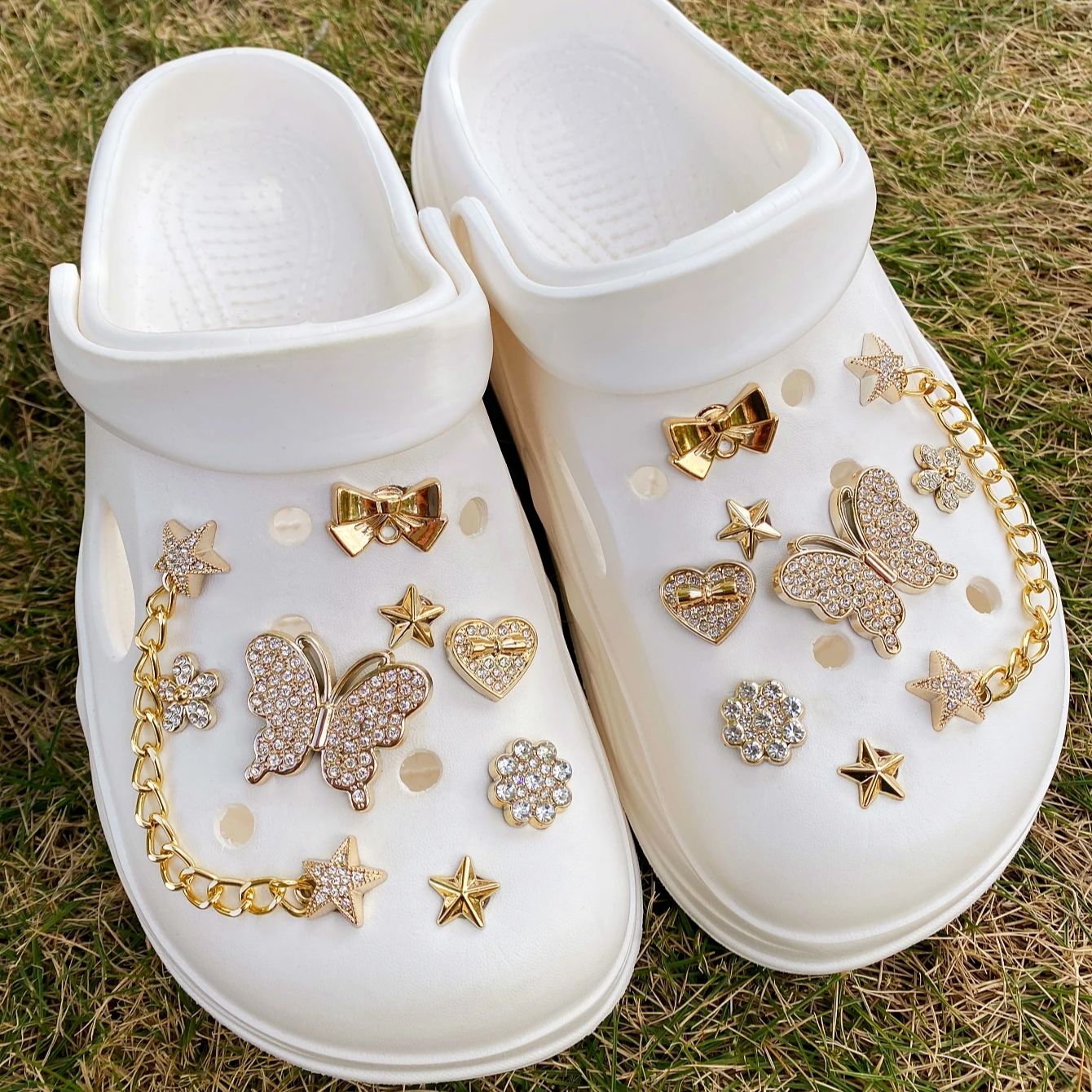 16 fashionable golden full diamond butterfly, heart, flower, five-pointed star chain crocs accessory ABS shoe flower, DLY decora