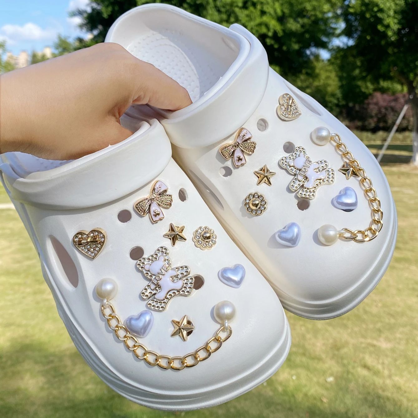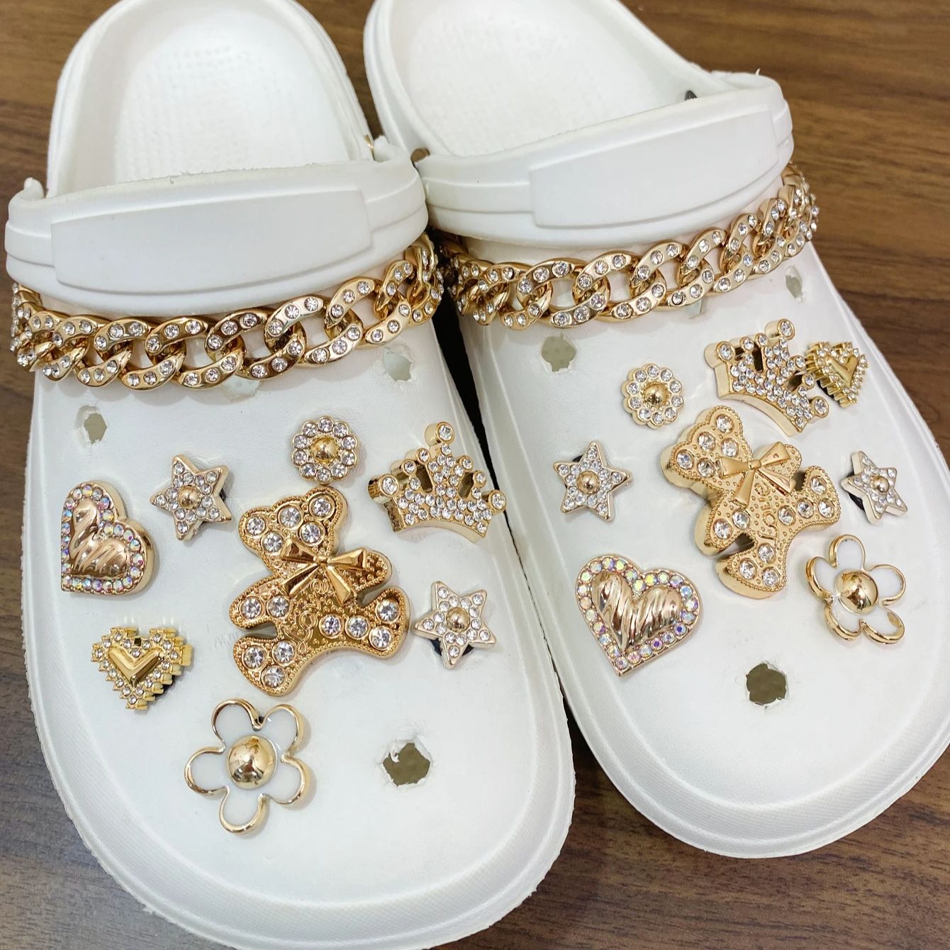 18 pieces of fashionable golden bow bear, crown, five-petal flower, diamond-dotted heart, five-pointed star crocs with detachabl
