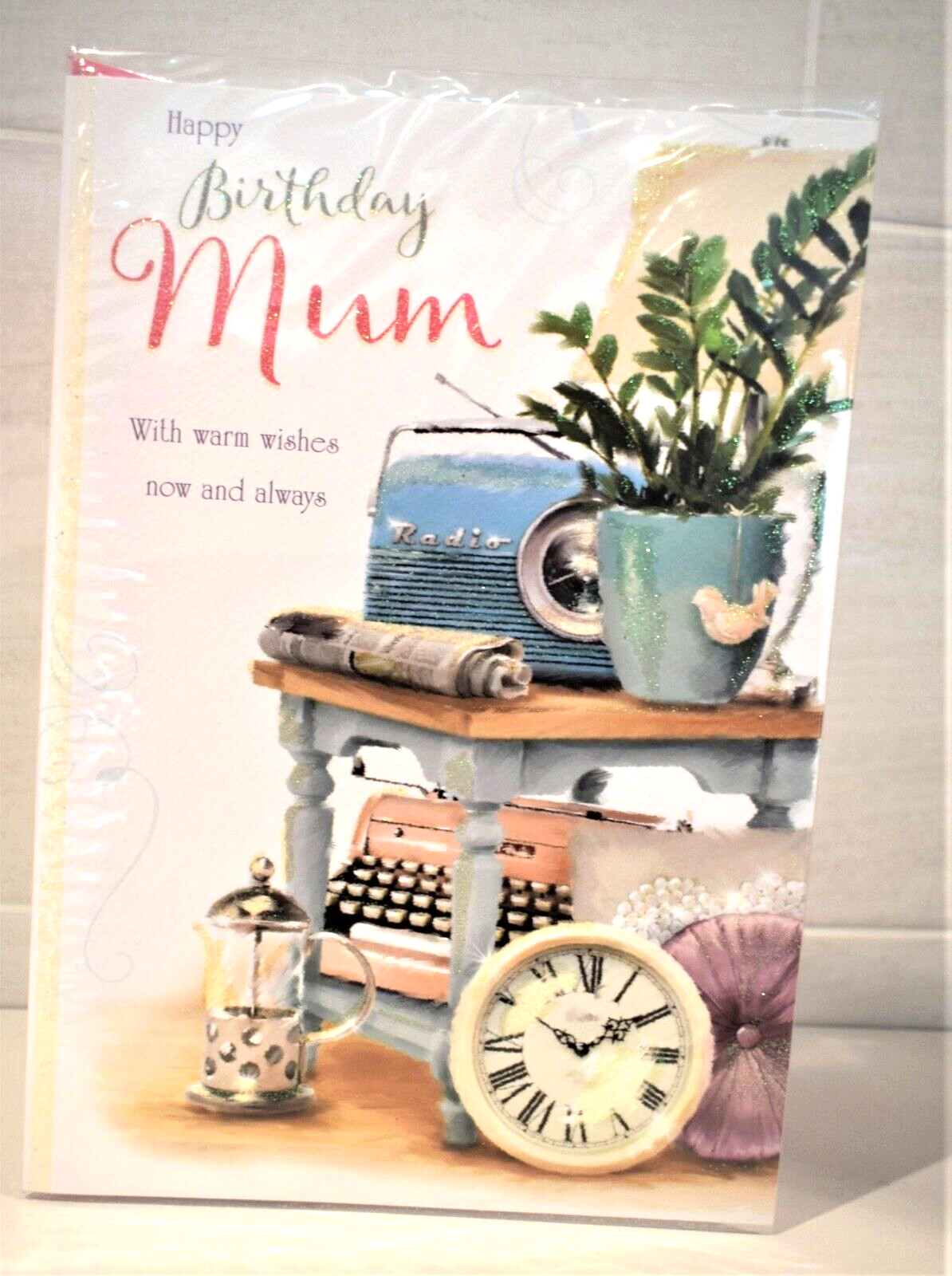Happy Birthday Mum Card Radio Newspaper Typewriter Coffee Clock on front