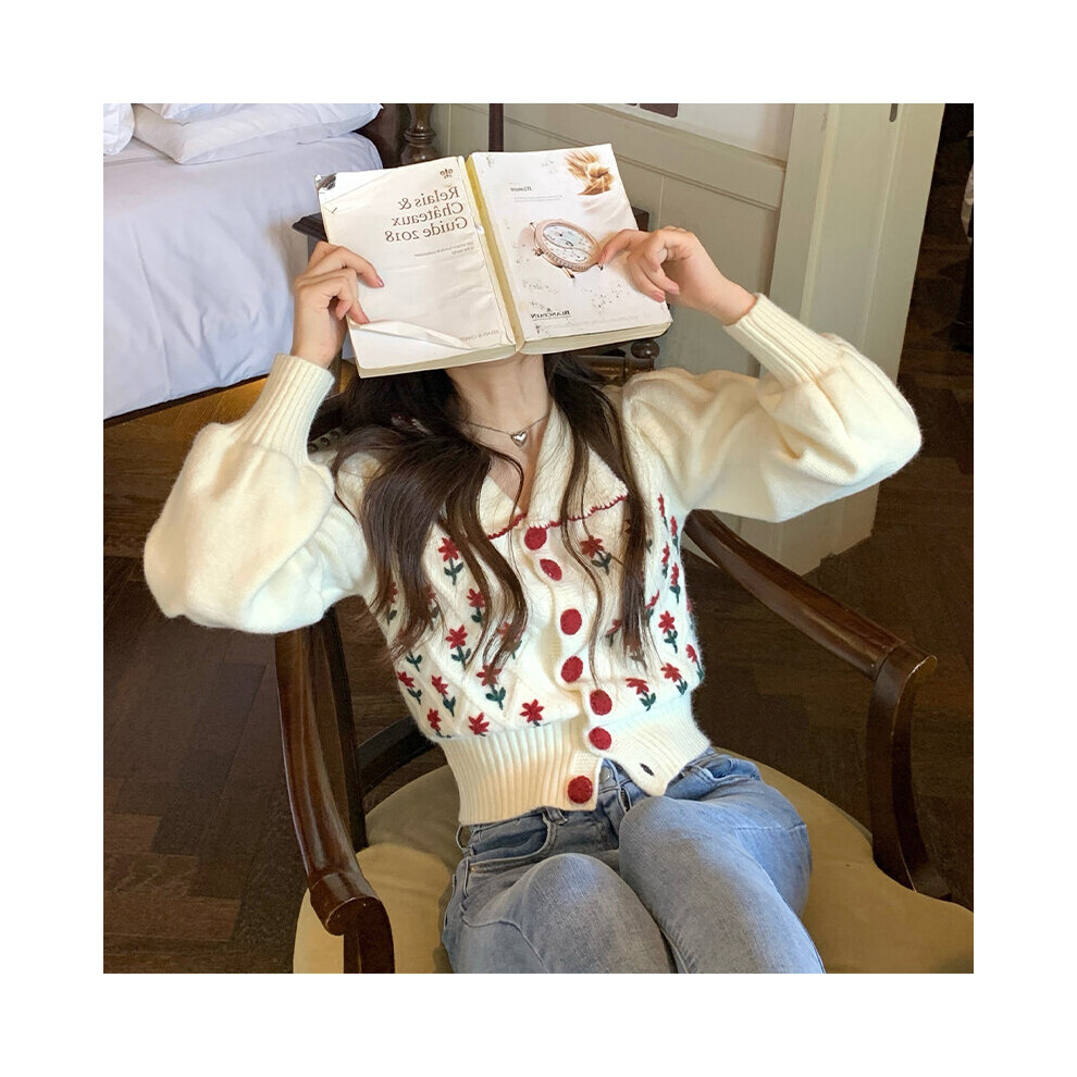 Autumn Sweet Retro Floral Embroidery Sweater Short Pull Femme Doll Shirts Lapel Puff Sleeve Cardigan Cropped Coat Women Tops