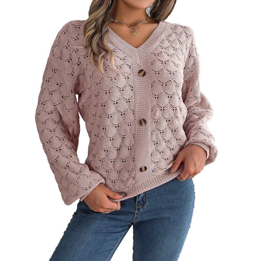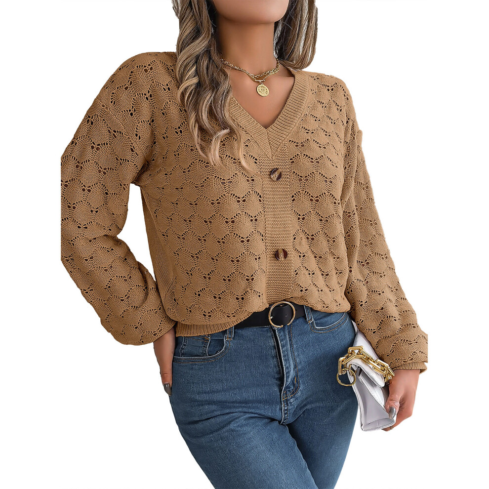 Cropped Cardigan Sweaters for Women Long Sleeve Crochet Knit Open Front V Neck Button Up Tops(Khaki,L)