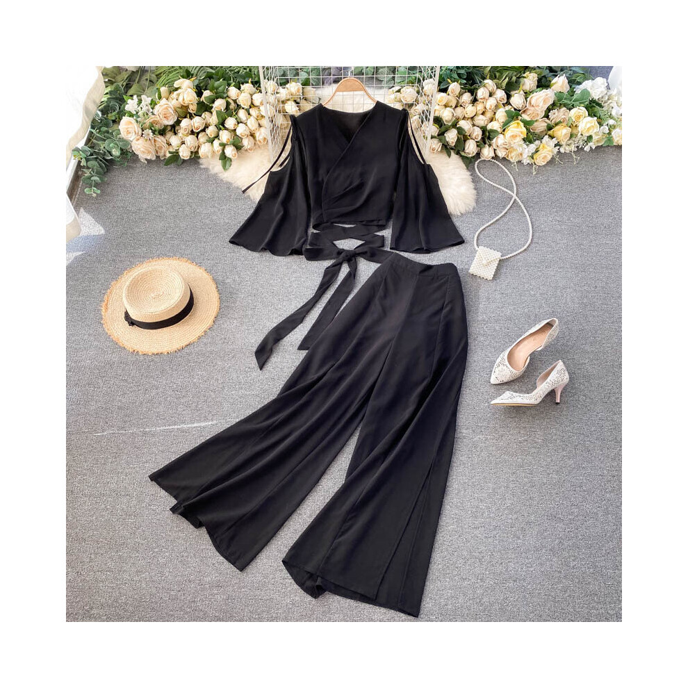 Bandage Cropped Cardigan Blouse Women Two Pieces Set Wide Leg High Waist Pants Female Summer Solid Suit Outfits