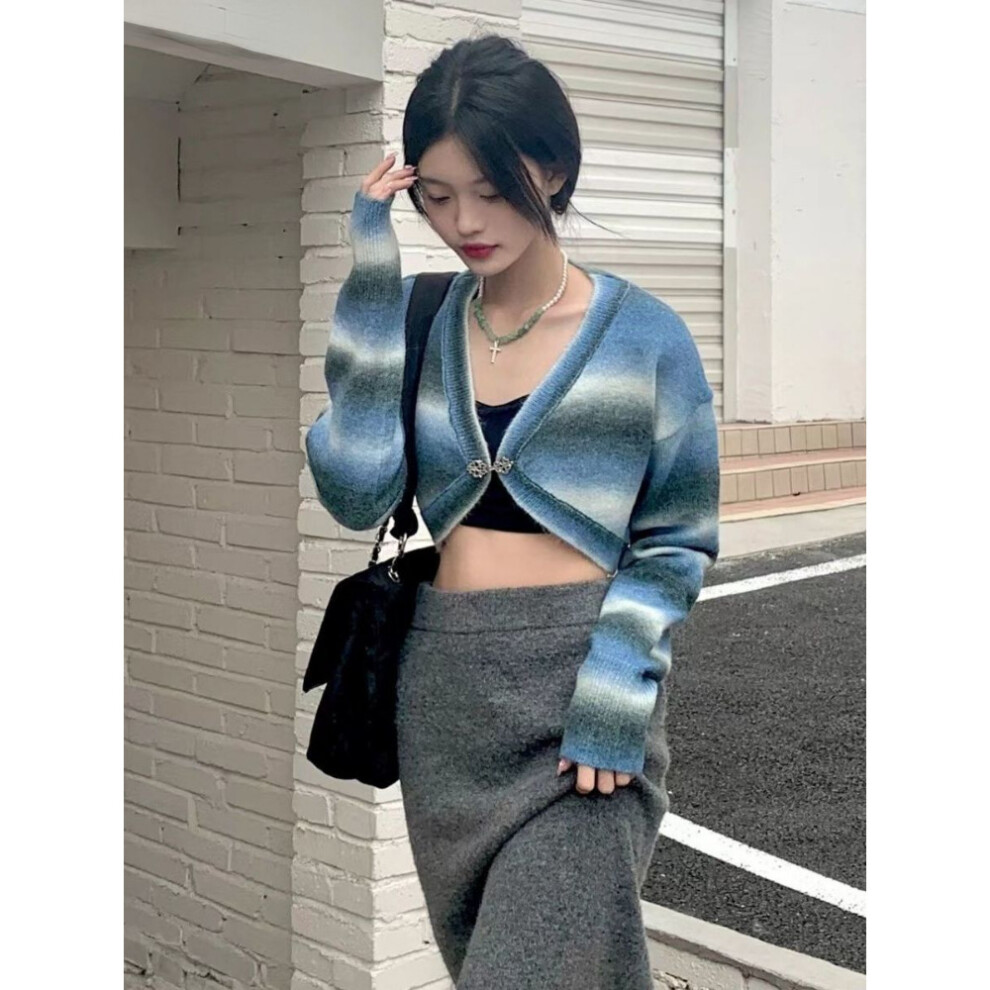 Y2k Gradient Cropped Knitted Slim Cardigan Women Vintage Sweet Fairy Grunge Harajuku All Match Tops Femme Streetwear