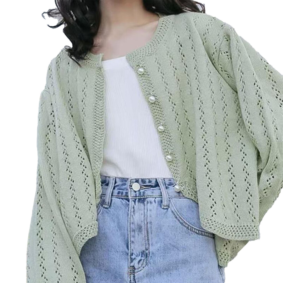 Cropped Cardigan Sweaters for Women Long Sleeve Crochet Knit Open Front V Neck Button Up Tops(Green,L)