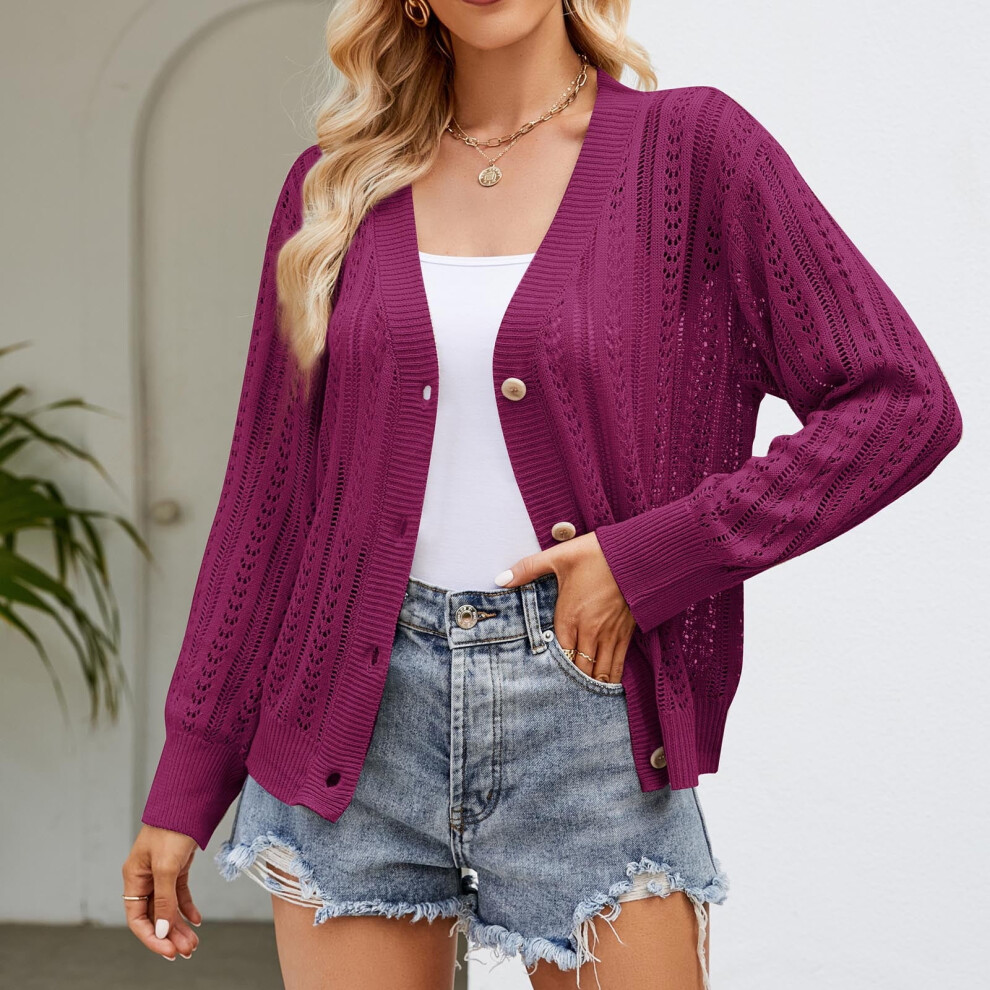 Cropped Cardigan Sweaters for Women Long Sleeve Crochet Knit Open Front V Neck Button Up Tops(Purple,Xl)