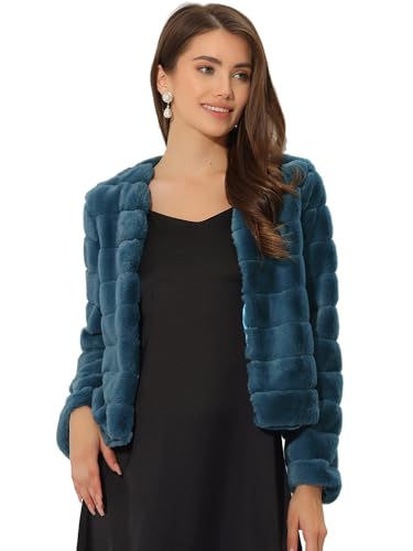 Allegra K Women's Winter Warm Cropped Jacket Collarless Faux Fur Fluffy Coat Dark Grey Blue S