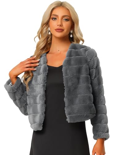 Allegra K Women's Winter Warm Cropped Jacket Collarless Faux Fur Fluffy Coat Gray S