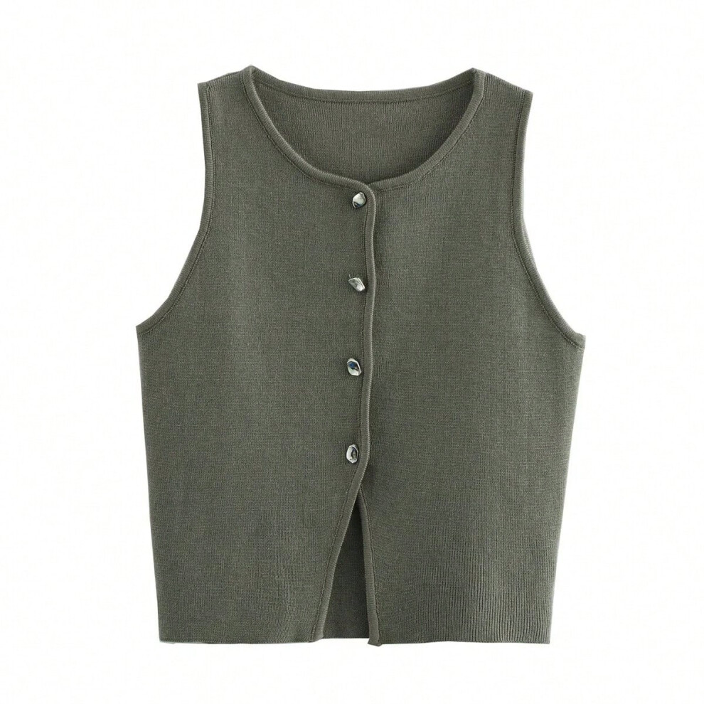 (army green, S) TRAF Pink Knit Sleeveless Vest Women Cropped Sweater Vest Top Women Yellow Button Vests for Women Streetwear Waistcoat Knitwears