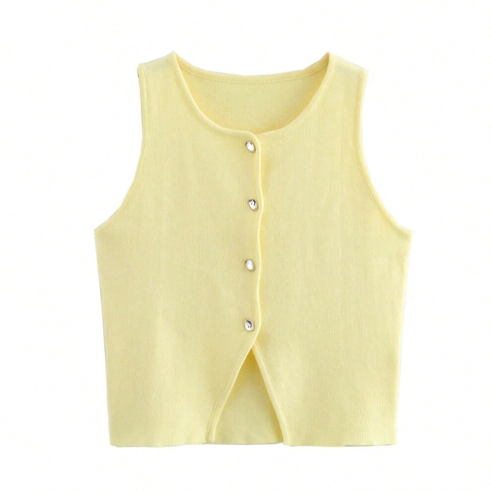 (Yellow, M) TRAF Pink Knit Sleeveless Vest Women Cropped Sweater Vest Top Women Yellow Button Vests for Women Streetwear Waistcoat Knitwears