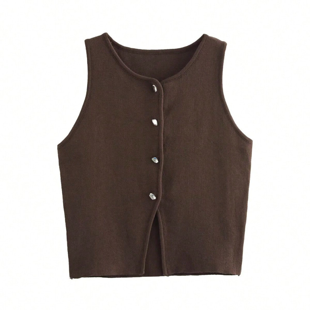 (brown, L) TRAF Pink Knit Sleeveless Vest Women Cropped Sweater Vest Top Women Yellow Button Vests for Women Streetwear Waistcoat Knitwears