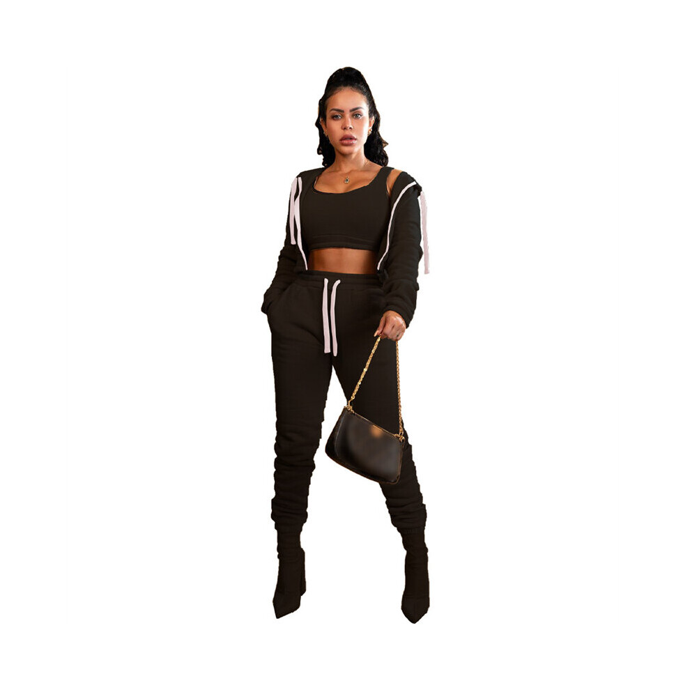 Solid Fleece 3 Piece Set Tracksuits Women Cropped Vest Top Long Sleeve Hooded Jackets Pockets Sweat Pants Jogger Suit