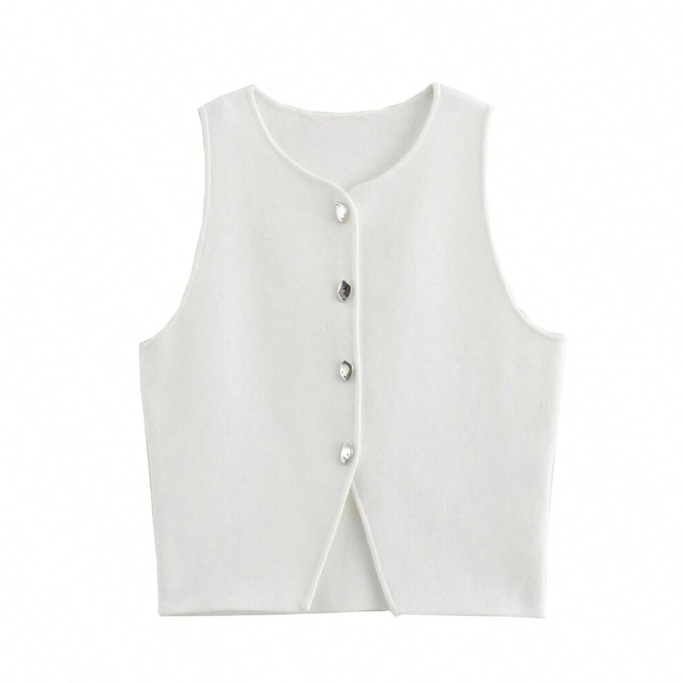 (WHITE, S) TRAF Pink Knit Sleeveless Vest Women Cropped Sweater Vest Top Women Yellow Button Vests for Women Streetwear Waistcoat Knitwears
