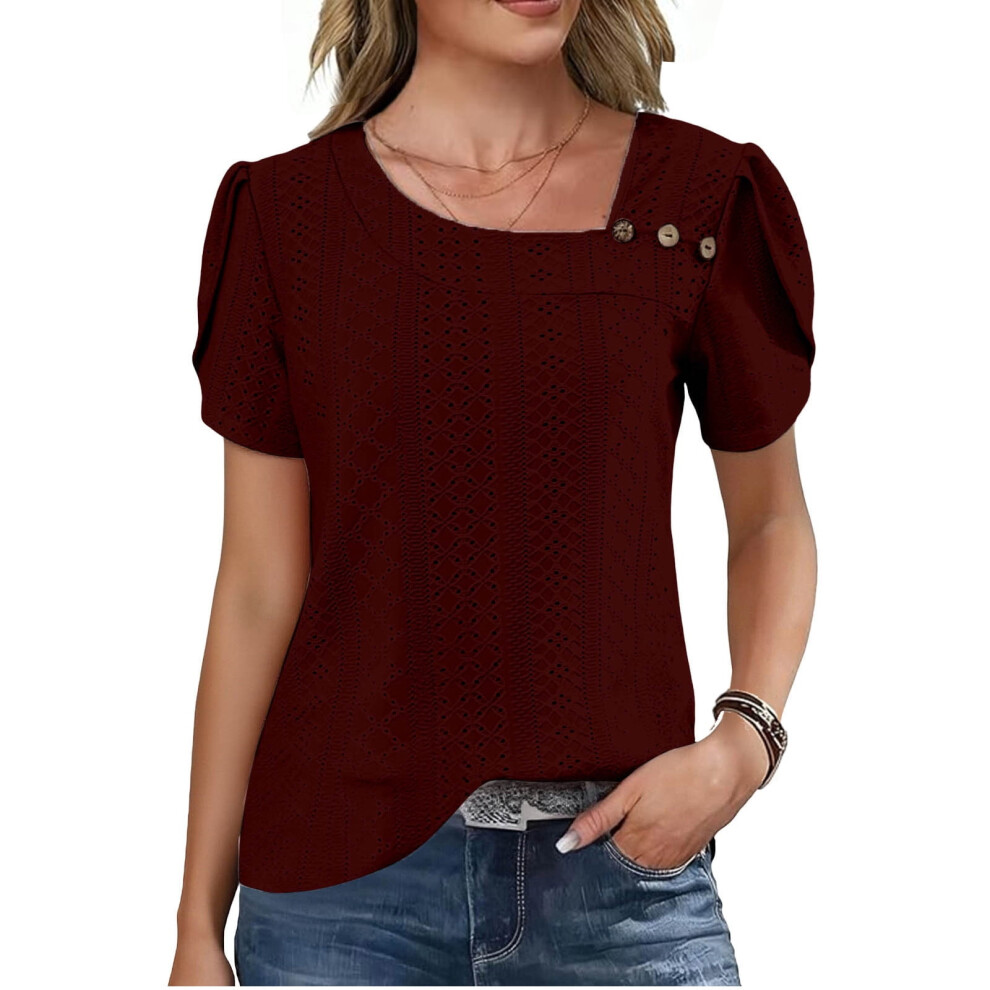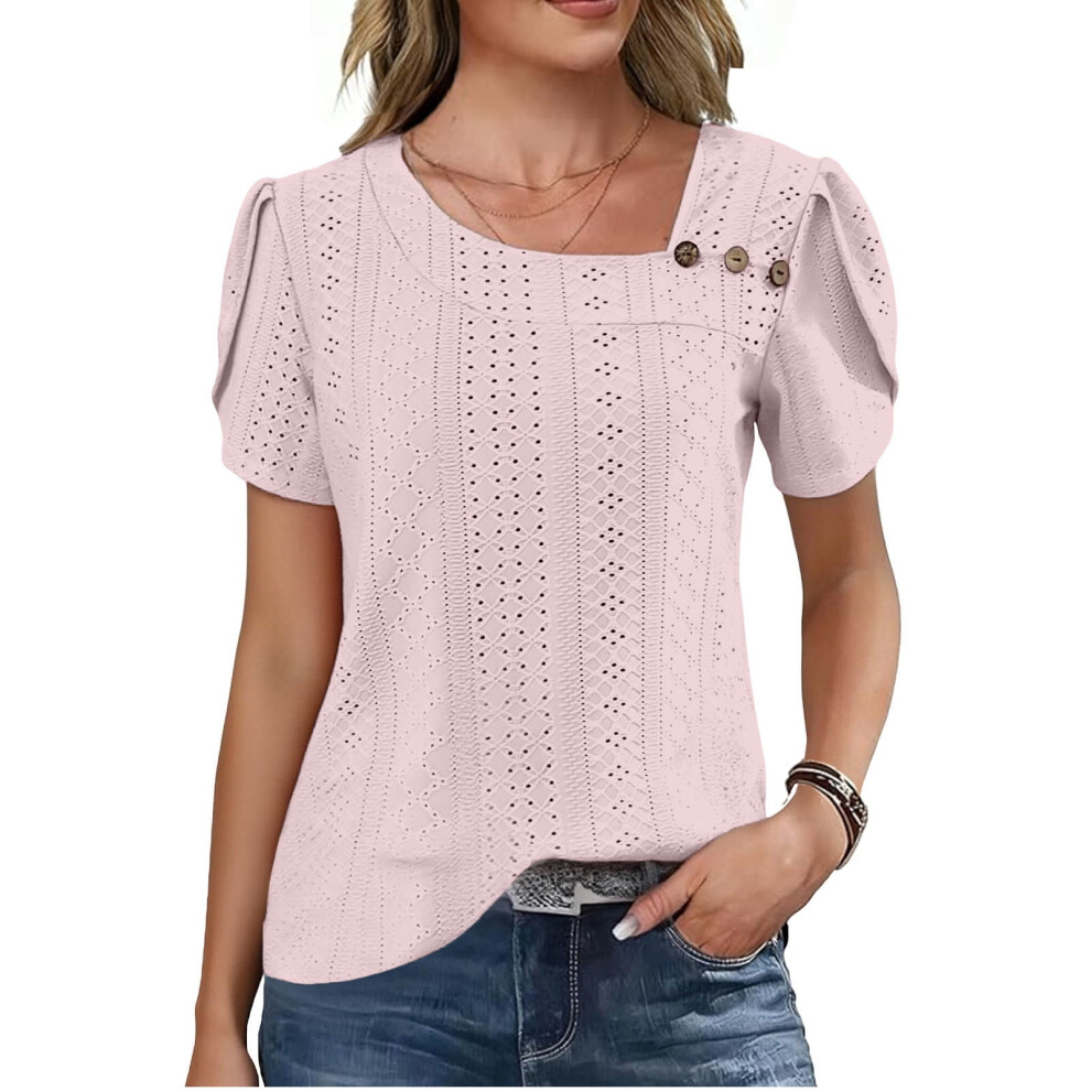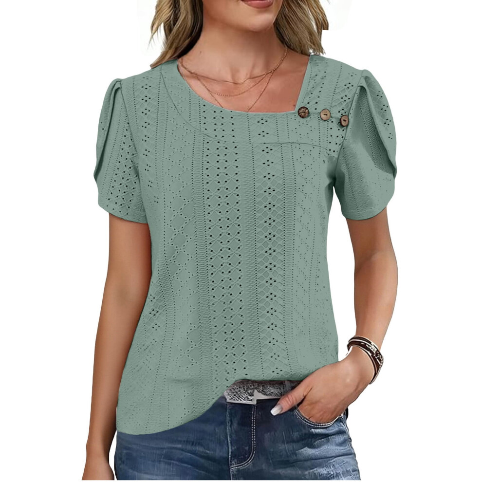 Women's Cropped Top Short Sleeve Irregular Neckline with Button Detail and Lace Trim Casual and Fashionable