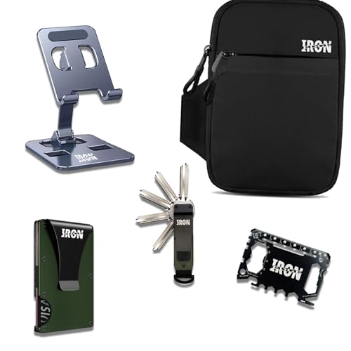 Iron Edge Men’s Gift Set, Everyday Carry Pack with Key Organiser, Wallet, Phone Stand, Multi Tool Card & Cross Body Bag Gift for Christmas, Father’s Day, & Birthday (Aluminium, Army Green, Black)