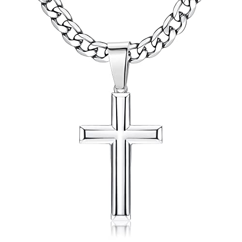 Chriscoco 925 Sterling Silver Cross Pendant Necklace for Men Women 5mm Stainless Steel Diamond-Cut Durable Cuban Link Chain Crucifix Necklace Polished Beveled Edge Cross Chain Necklace Jewelry