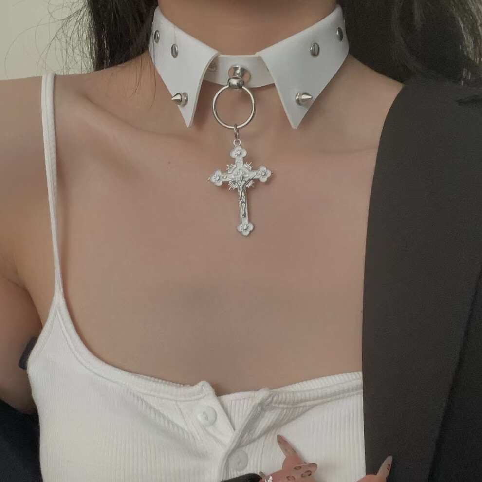 (A white collared cross collar) Dark punk style necklace, cross collar, fashionable neck chain, sweet and cool collarbone chain accessory