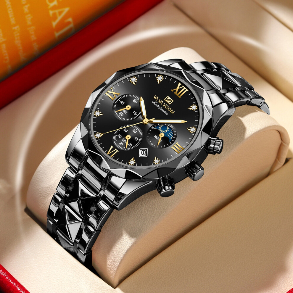(Multi-functional - Gold nails and black chain) This is a waterproof and fashionable men's wristwatch with a diamond-shaped dial design for cross-bord
