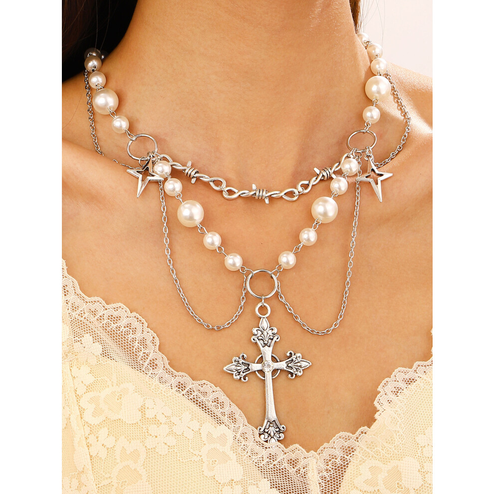 QYYZTQY Silver Gothic Cross Pearl Necklaces Men and Women, Cute HeartAshaped Thick Chain A Vintage Pendants, OT Buckle with Toggle Clasp for