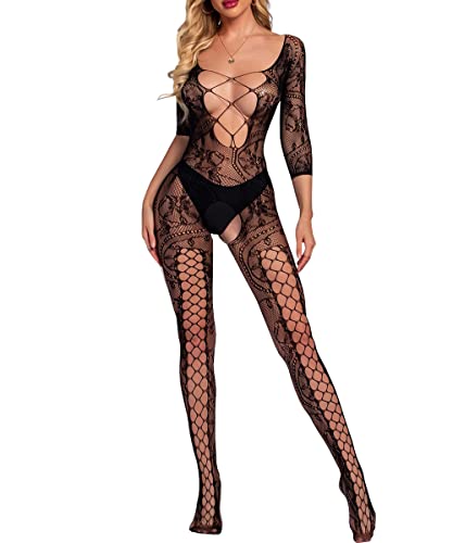 Buitifo Womens Fishnet Bodystocking Plus Size Crotchless Bodysuit Sexy Tights Soft Nightwear Lingerie for Women(Black DZJ,One size)
