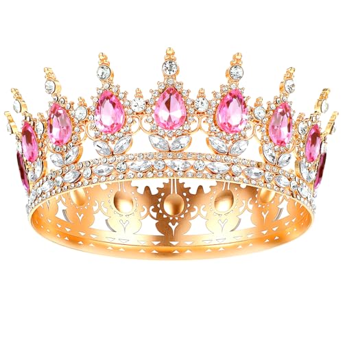 PEOVLVN Gold Crown Cake Topper Queen Crown Rhinestone Crowns and Tiaras for Women Crystal Birthday Crown Headband for Princess Party Wedding Bride Hair Accessories (Pink)