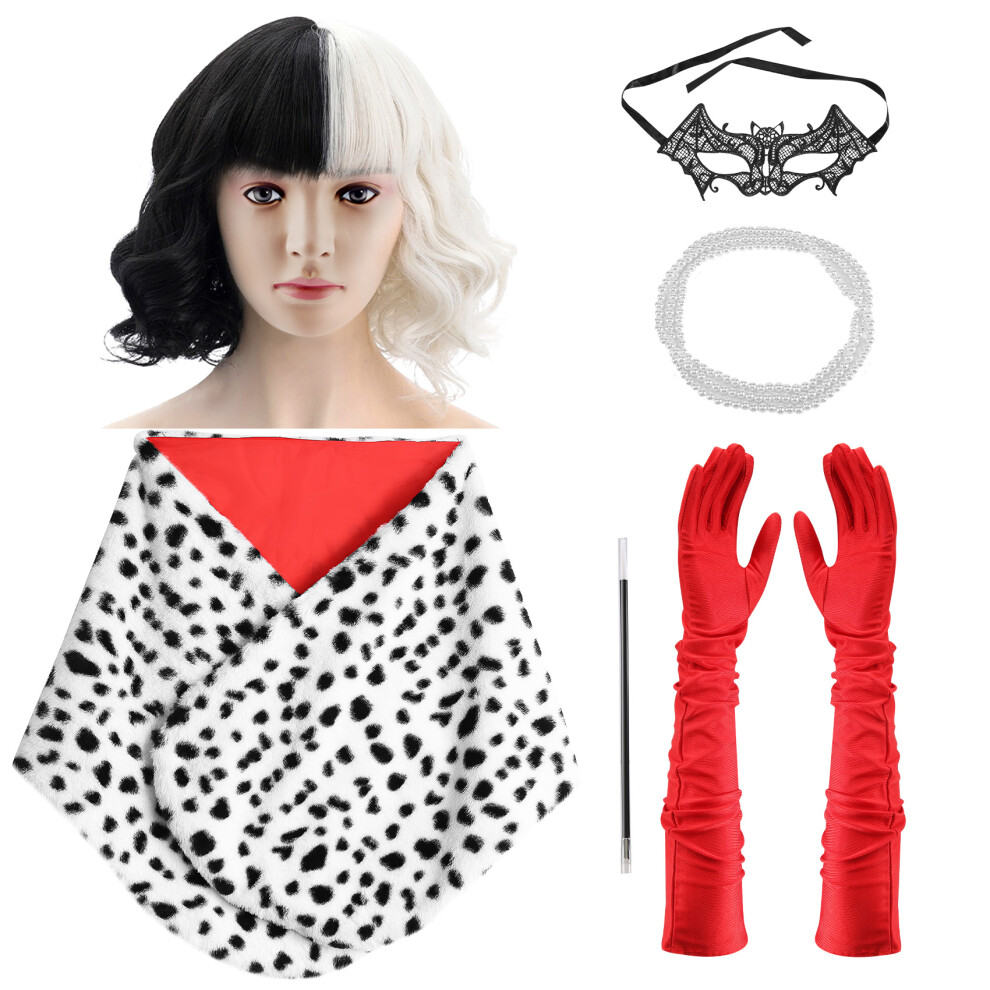 6Pcs Cruella Deville Costume Set for Women, Cruella Cosplay Outfits Kit with Cape Black and White Wig Pearl Necklace Gloves Hand Prop for World Book Day Halloween Carnivals Cosplay Themed Parties