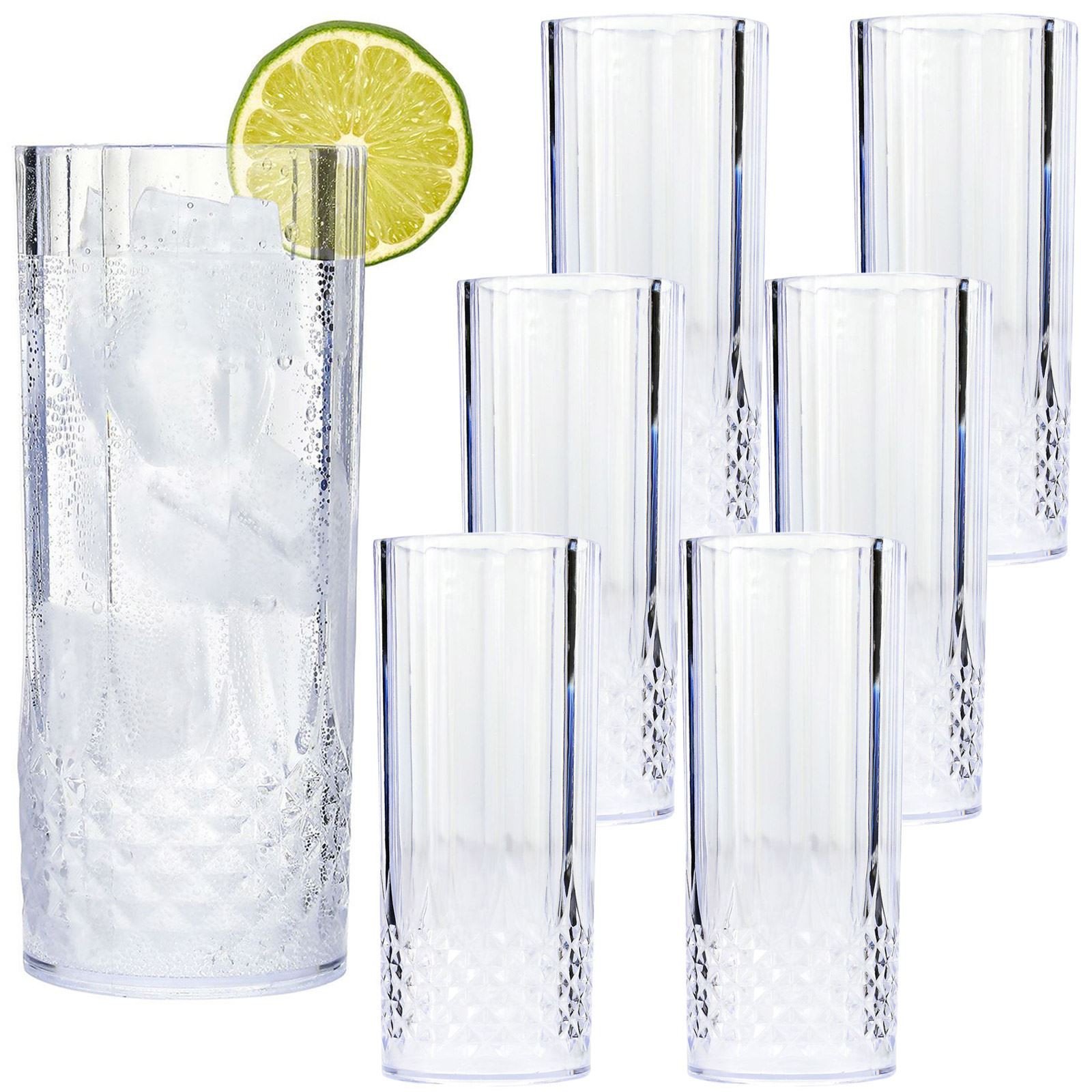 Clear Crystal Effect Highball 6PK Long Drinking Plastic Glasses Tumbler Reusable