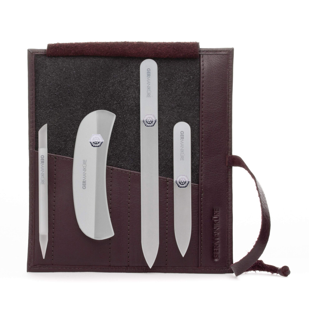 GERMANIKURE Crystal Glass Nail File Set in Eggplant Purple Leather Case - Handmade in Czech Republic - Professional Manicure & Pedicure Supplies - Gla