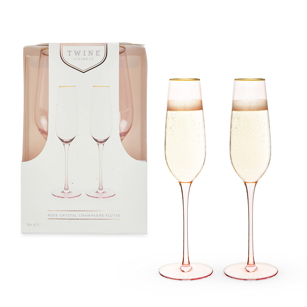 TWINE Rose champagne Flutes gold Rimmed Pink Tinted crystal Wine glass Set Stemmed Sparkling Wine glasses Set of 2 8 Ounces