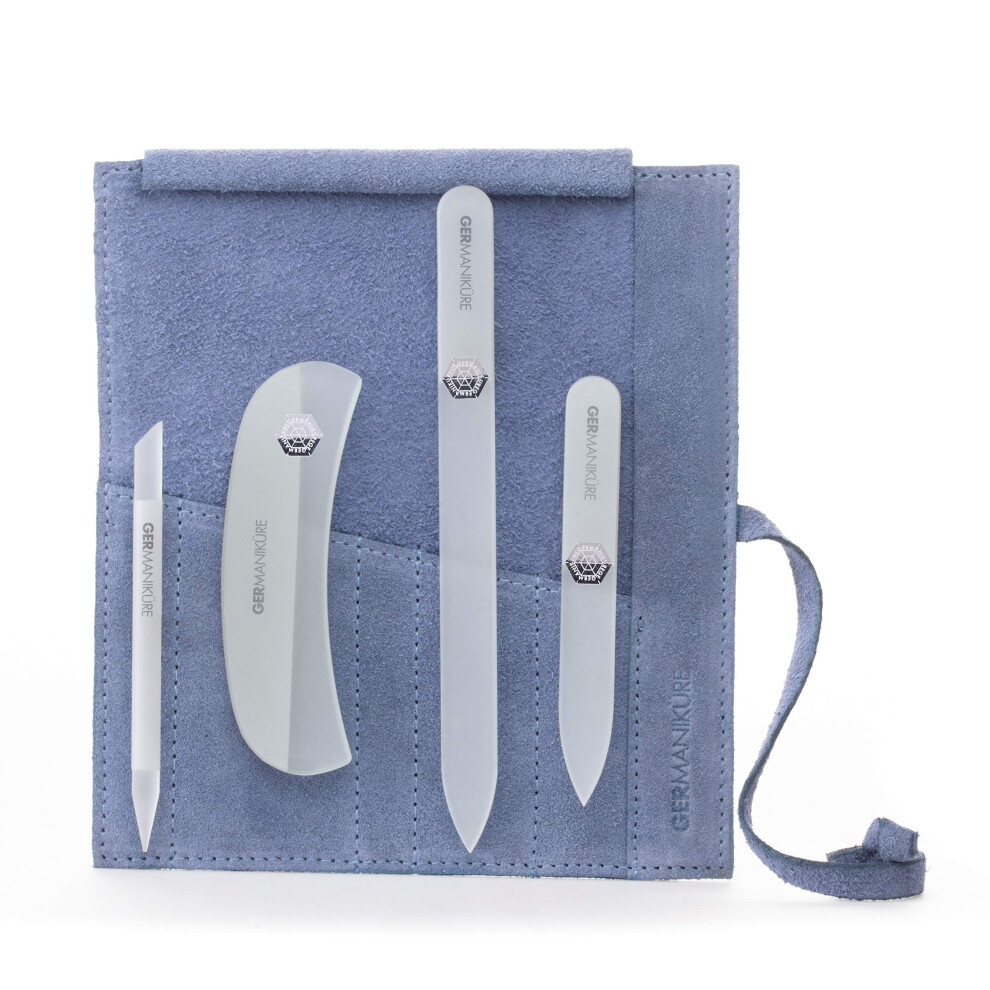 GERMANIKURE Crystal Glass Nail File Set in Light Blue Suede Case - Handmade in Czech Republic - Professional Manicure & Pedicure Supplies - Glass Cuti