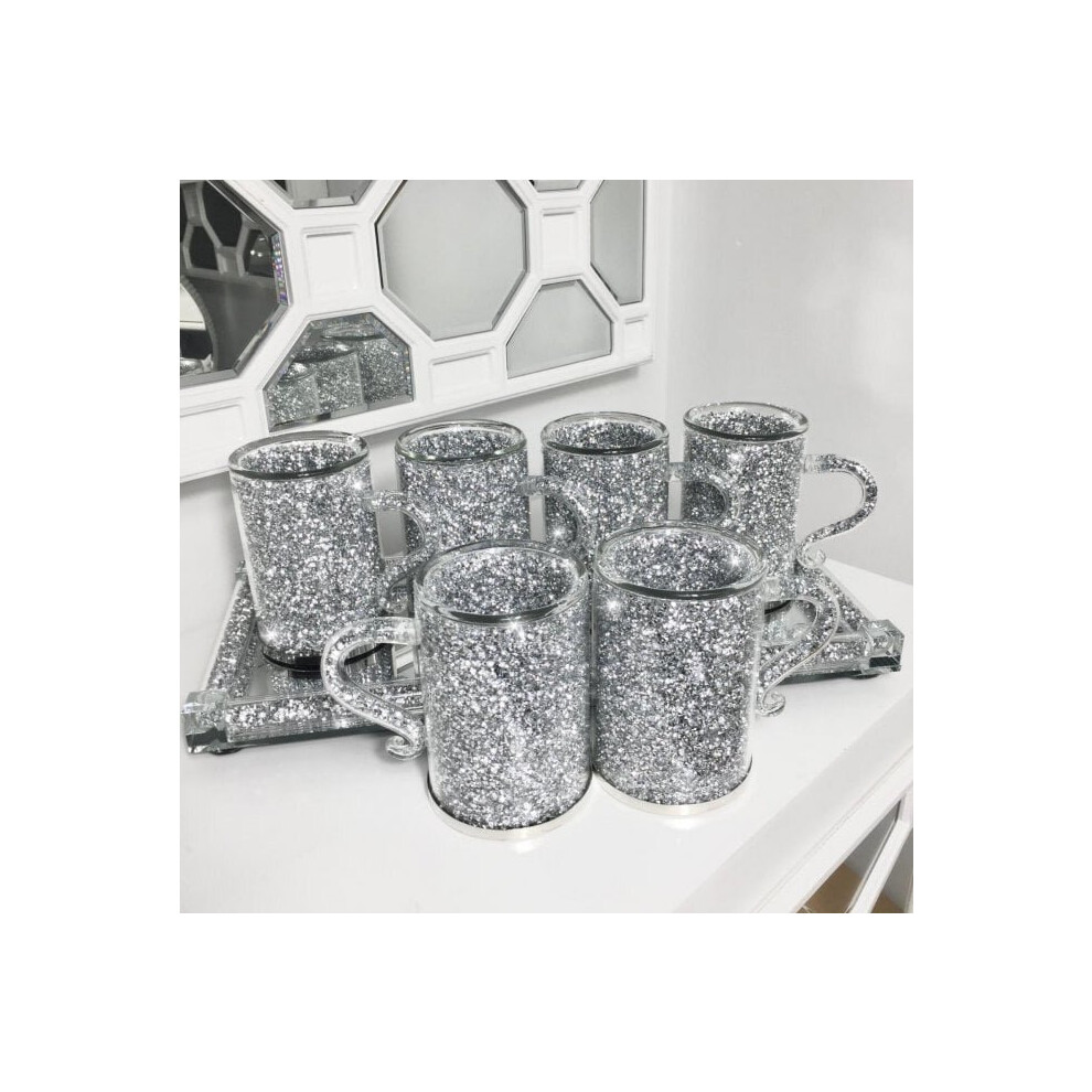 Crushed Diamond Crystal-Filled Mugs, Set of 6 - Silver Glass Encased Coffee Cups (300ml) | Standard Size