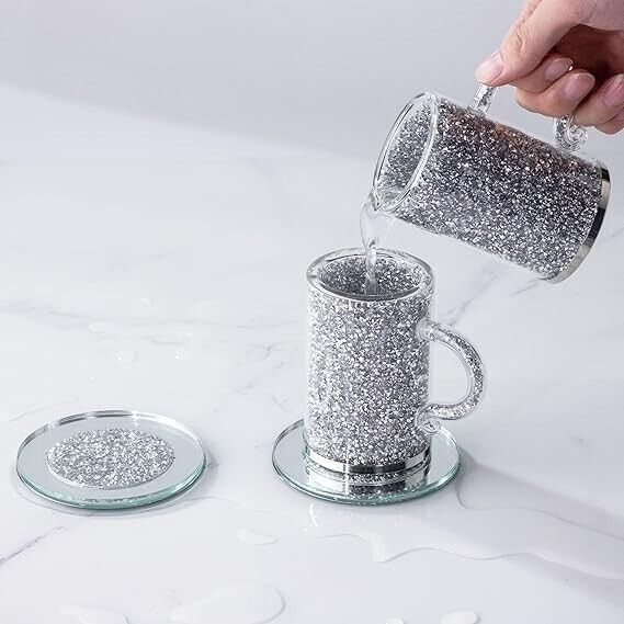 Set of 2 Crystal Mugs & Coasters - Crushed Diamond Ornament For Kitchen-Silver