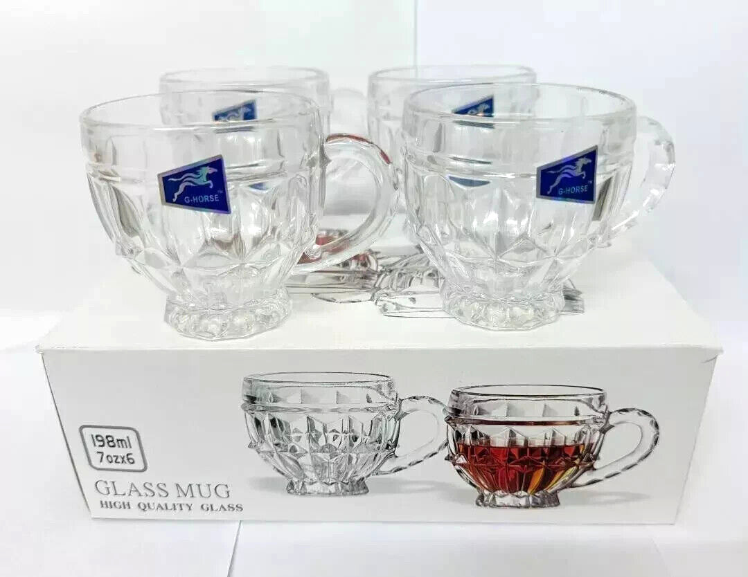 6pc Crystal Cut Glass Tea Coffee Cup Mug Hot Latte Tea Drinking Mugs Set G-Horse