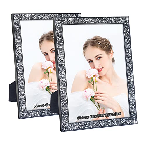 Vinelftage 5x7 Picture Frames Set of 2 Crystal Glitter Diamond Mirror Picture Frame, Metal Glass Wall Photo Frames for Wall or Desktop Display(Black)