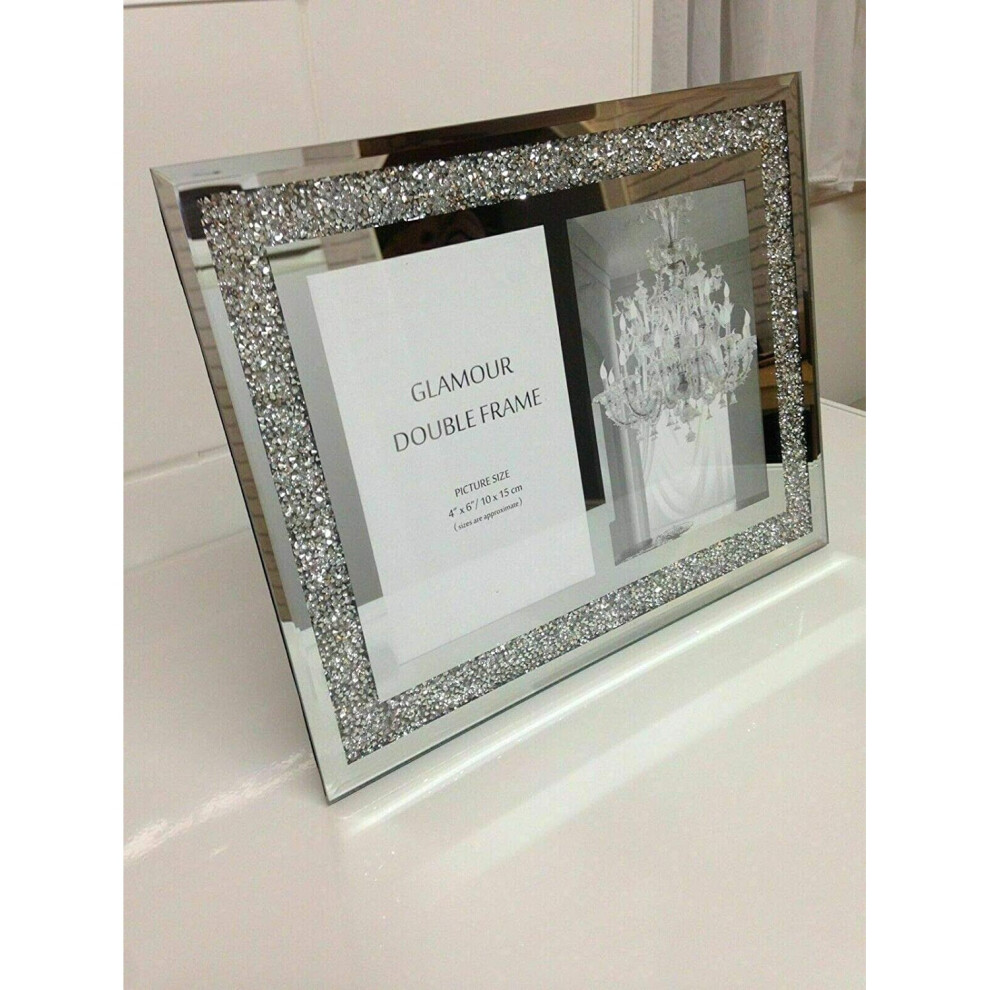 Glass Photo Frame Jewel Mirror Silver Loose Diamante New Crystal Decor Mirror Photo Frame Sparkle Gift Wedding Friends For Desk (Double 4 X 6 Inches)