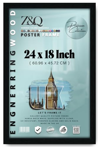 Modern Black 18 x 24 Inch Poster Frame Crystal Clear Aclyic Front Picture Photo Frame 24x18 Inch MDF Backing With Both Ways Hanging Hooks - Home Office Use
