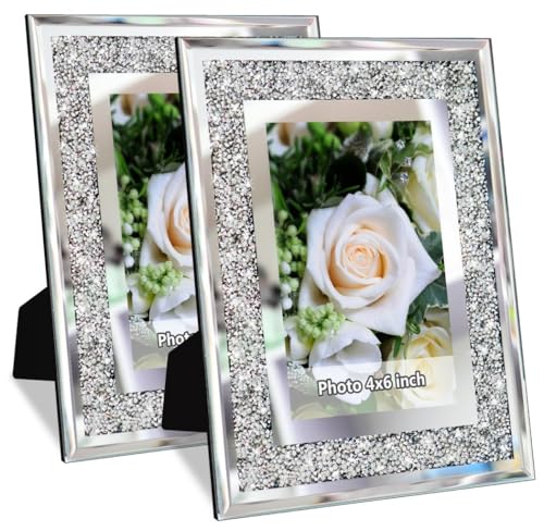 Crush Diamond Mirror Photo Frame In Bling Sparkle Crystal Silver Glass Finish, For Picture Size 4x6 inch, Pack of 2 Piece, table top Stand frame & Wall Frame.