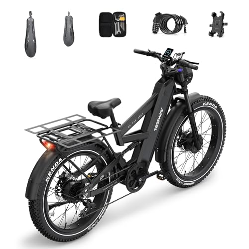 TESWAY X9 Dual Motor Ebike, 26" Fat Tire Full Suspension AWD Electric Bike, 240NM Fast Electric Bike, 48V 30Ah 120 Miles Long Range E-Bikes (X9+Rear Rack+Fender+Light, Black)