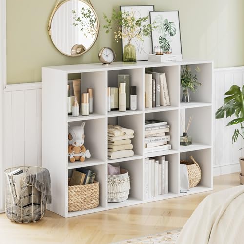 HOCSOK Cube Bookcase Bookshelf with 12 Cube Storage Units Wooden Display Shelving Storage Unit Office Living Room Furniture, White, 91 x 29 x 120 cm