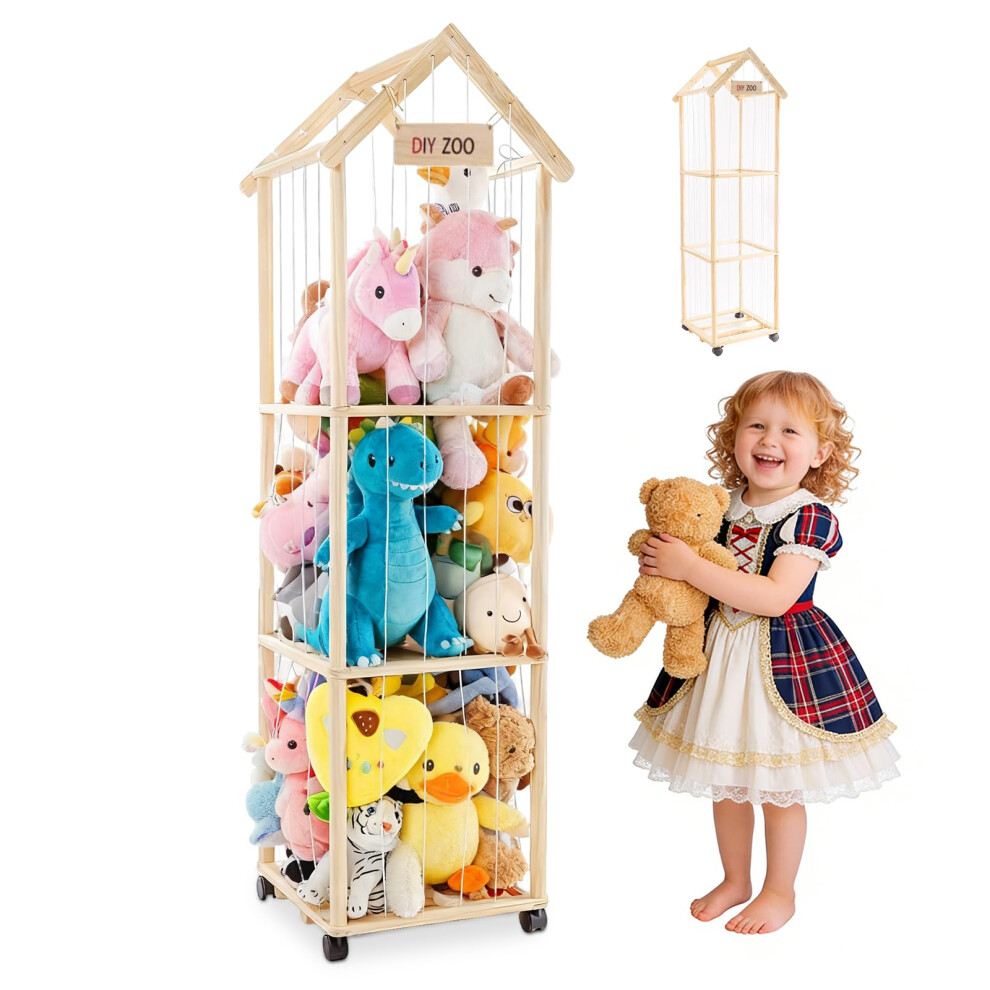Caossuixin Soft Toy Storage,3-Tier Solid Wood Teddy Storage Organizer with 360 Swivel Castors,Large Soft Cuddly Toy Storage Zoo with Elastic Band fo