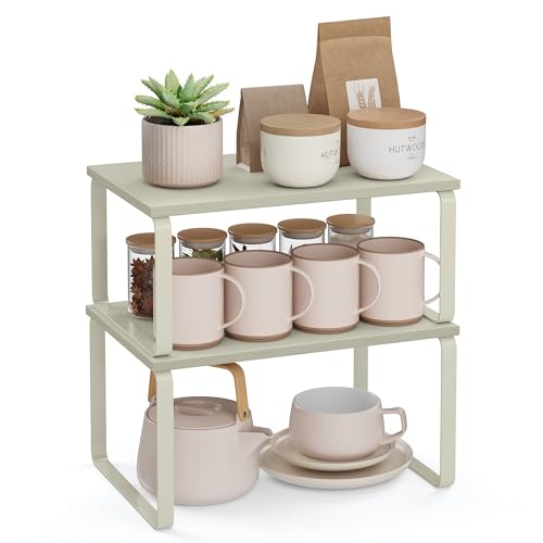 SONGMICS Spice Racks, Set of 2 Cupboard Organisers, Kitchen Storage, Stackable, Expandable, Metal Counter Shelves, Oatmeal Beige KCS001K01