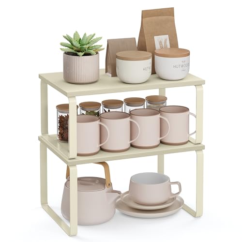 SONGMICS Spice Rack, Set of 2 Cupboard Shelf Organisers, Expandable Kitchen Shelf Organiser, Stackable Spice Holder, Metal and Engineered Wood, Cream White KCS002W02