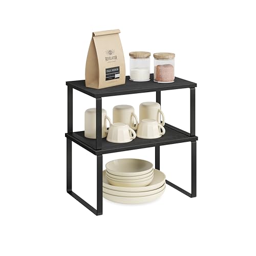 SONGMICS Spice Racks, Set of 2 Cupboard Organisers, Kitchen Storage, Stackable, Expandable, Metal Counter Shelves, Ink Black KCS401B01