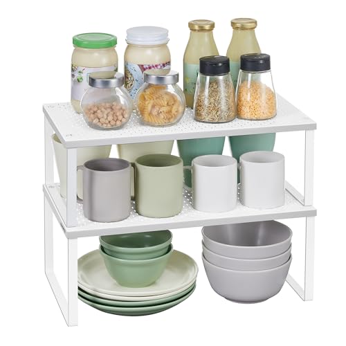 SONGMICS Spice Racks, Set of 2 Cupboard Organisers, Kitchen Storage, Stackable, Expandable, Metal Counter Shelves, White KCS005W01