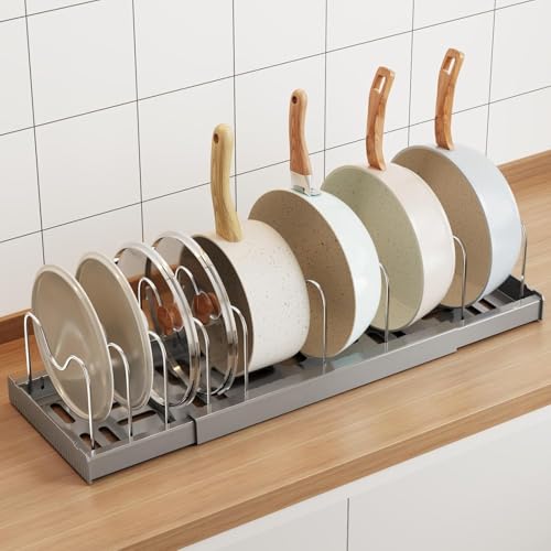 Mustorn Expandable Pan Lid Holder, Anti-scratch Pots and Pans Organiser Retractable Food Container Lid Organisers Pan Organiser for Cupboard with Adjustable 9 Dividers Baking Tray Storage Rack (Gray)