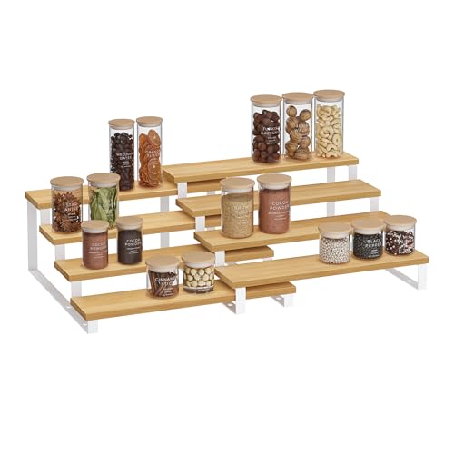 SONGMICS Kitchen Cupboard Organisers, Set of 4 Counter Storage Shelves, Stackable, Expandable Spice Racks, Metal and Engineered Wood, Cloud White and Snow White KCS027W01