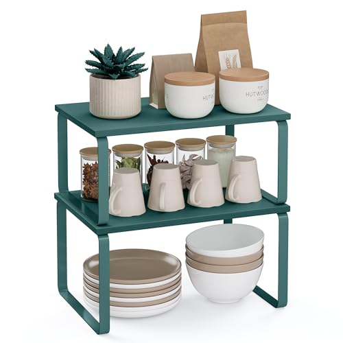 SONGMICS Spice Racks, Set of 2 Cupboard Organisers, Kitchen Storage, Stackable, Expandable, Metal Counter Shelves, Laurel Green KCS001C01