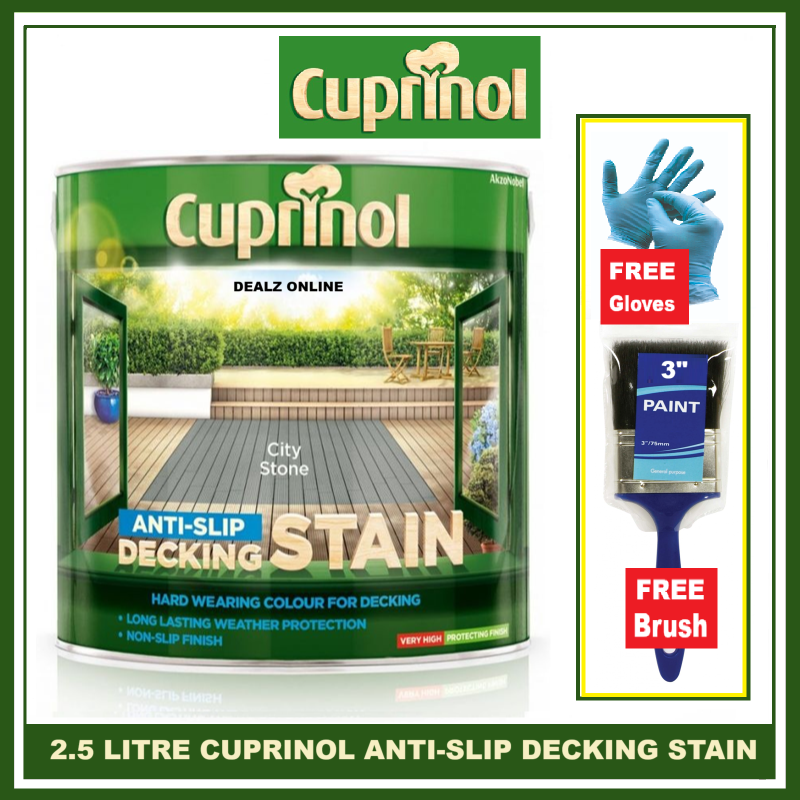 Cuprinol Anti Slip Decking Stain CITY STONE ASH 2.5L + FREE 3" BRUSH & GLOVES