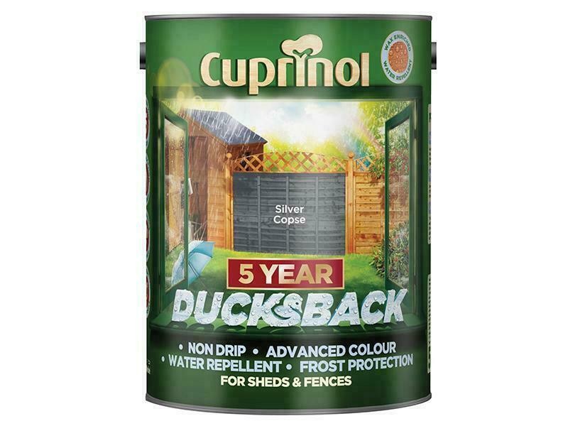 New 2018 Cuprinol Ducksback Shed & Fence Paint 5 Litre Silver Copse. Non Drip, Water Repellent and Frost Defence. Protection for 5 Years. Includes PSP
