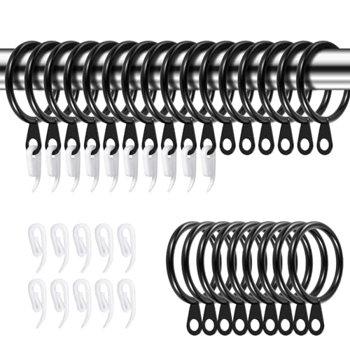 Curtain Rings and Hooks 24 Pcs – Bigger Curtain Rings Metal with 32mm Inner Diameter & Eyelets for Shower Curtains, Decorative Drapery – Durable Curtain Pole Rings & Plastic Hooks- Black