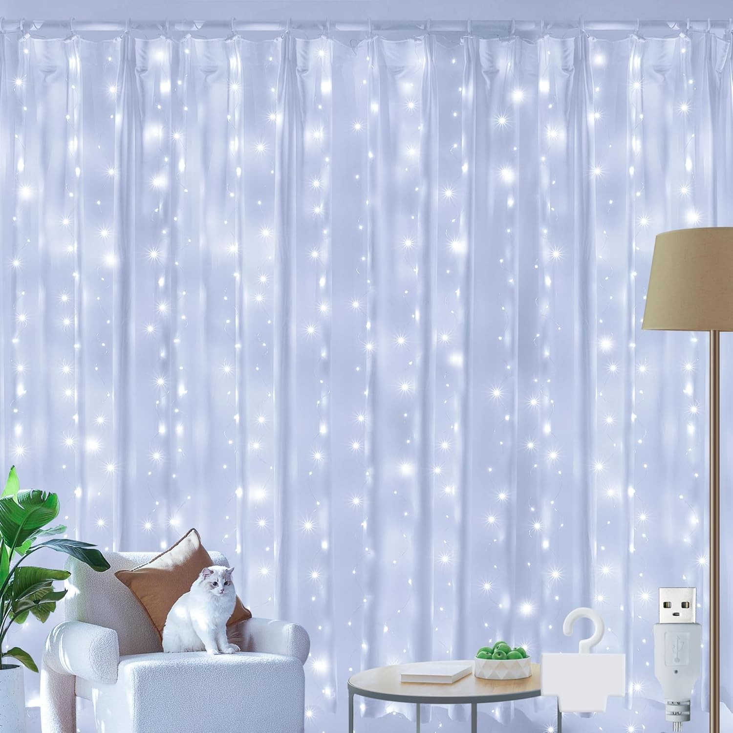 Curtain Fairy Lights 300 LED, USB Copper Wire, Warm White - 3M X 3M